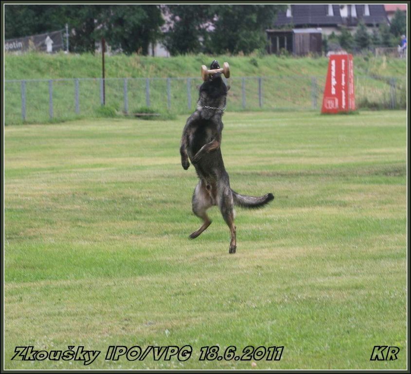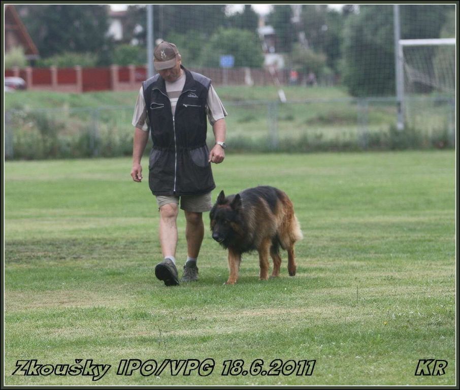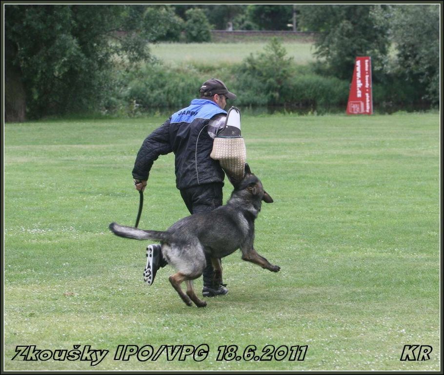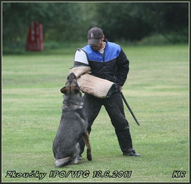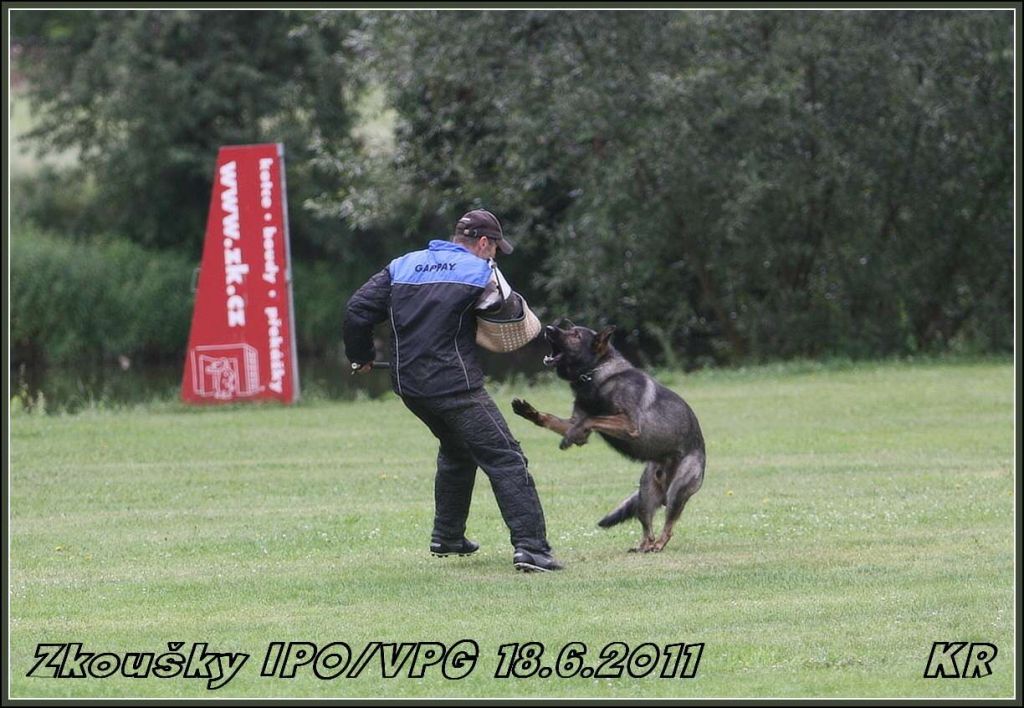 Začínal Vláďa Kasl s Iccem z Gargamellu. Pan rozhodčí ohodnotil předvedenou obranu 85 body. O jeden bod více, celkem 86 bodů, získala Petra Fürstová se Chakirou z Gargamellu. Chakira byla bojovnější a razantnější než Icco, ztratila dva body na předposlední maketě, tři body na vyštěkání, zbytek bodíků ztratila na zákusech. Další dvojková obrana byla Buggina s Kájou. Buggina měla evidentně jasno v tom, že nějaké makety rozhodně běhat nebude, takže oběhla jen jednu a pak už si to hasila na figuranta, čímž ztratila pár bodů. Vyštěkání bylo pěkné, zbytek bodů ztratila na zákusech. Výsledných 80 bodů a velká spokojenost jak Káji, tak i paničky Světlany.