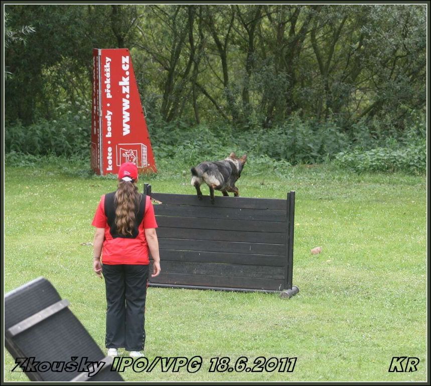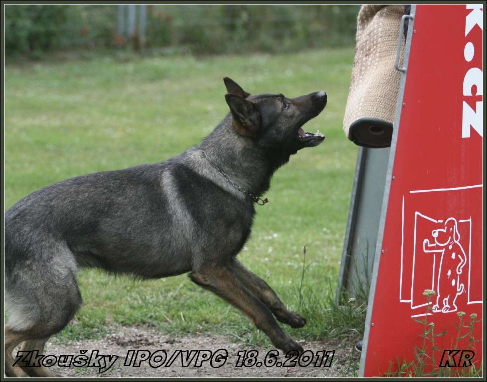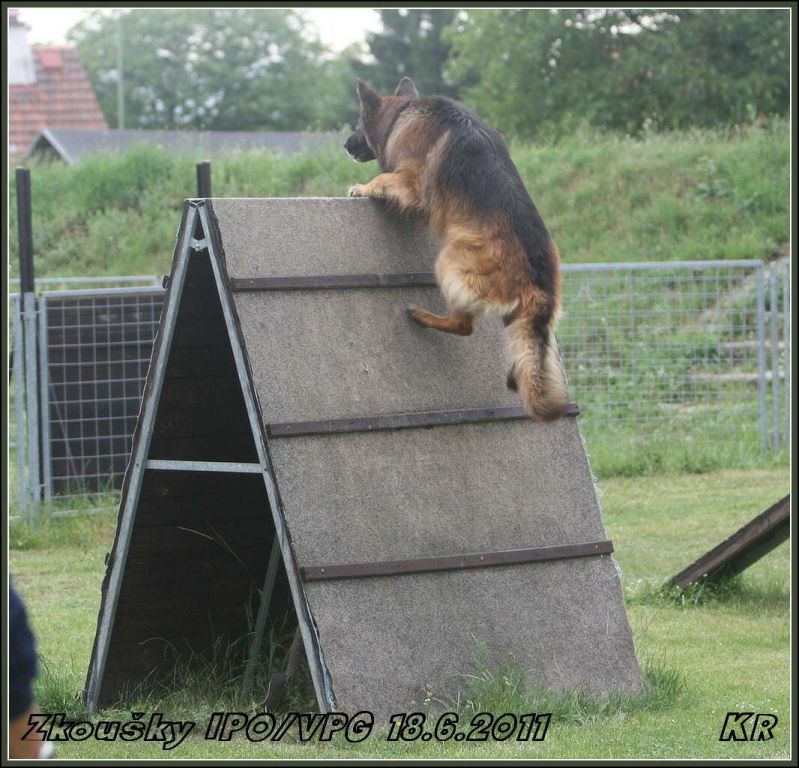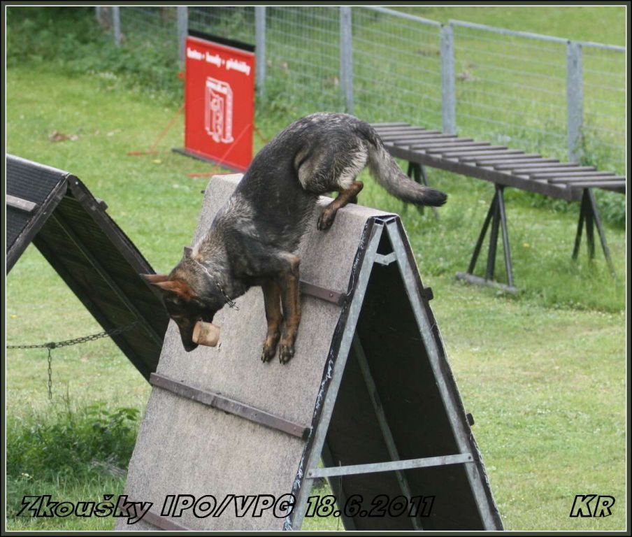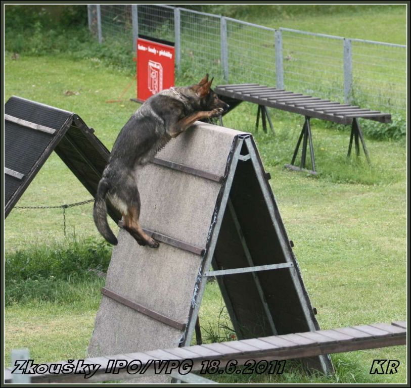 Začínal Vláďa Kasl s Iccem z Gargamellu. Pan rozhodčí ohodnotil předvedenou obranu 85 body. O jeden bod více, celkem 86 bodů, získala Petra Fürstová se Chakirou z Gargamellu. Chakira byla bojovnější a razantnější než Icco, ztratila dva body na předposlední maketě, tři body na vyštěkání, zbytek bodíků ztratila na zákusech. Další dvojková obrana byla Buggina s Kájou. Buggina měla evidentně jasno v tom, že nějaké makety rozhodně běhat nebude, takže oběhla jen jednu a pak už si to hasila na figuranta, čímž ztratila pár bodů. Vyštěkání bylo pěkné, zbytek bodů ztratila na zákusech. Výsledných 80 bodů a velká spokojenost jak Káji, tak i paničky Světlany.